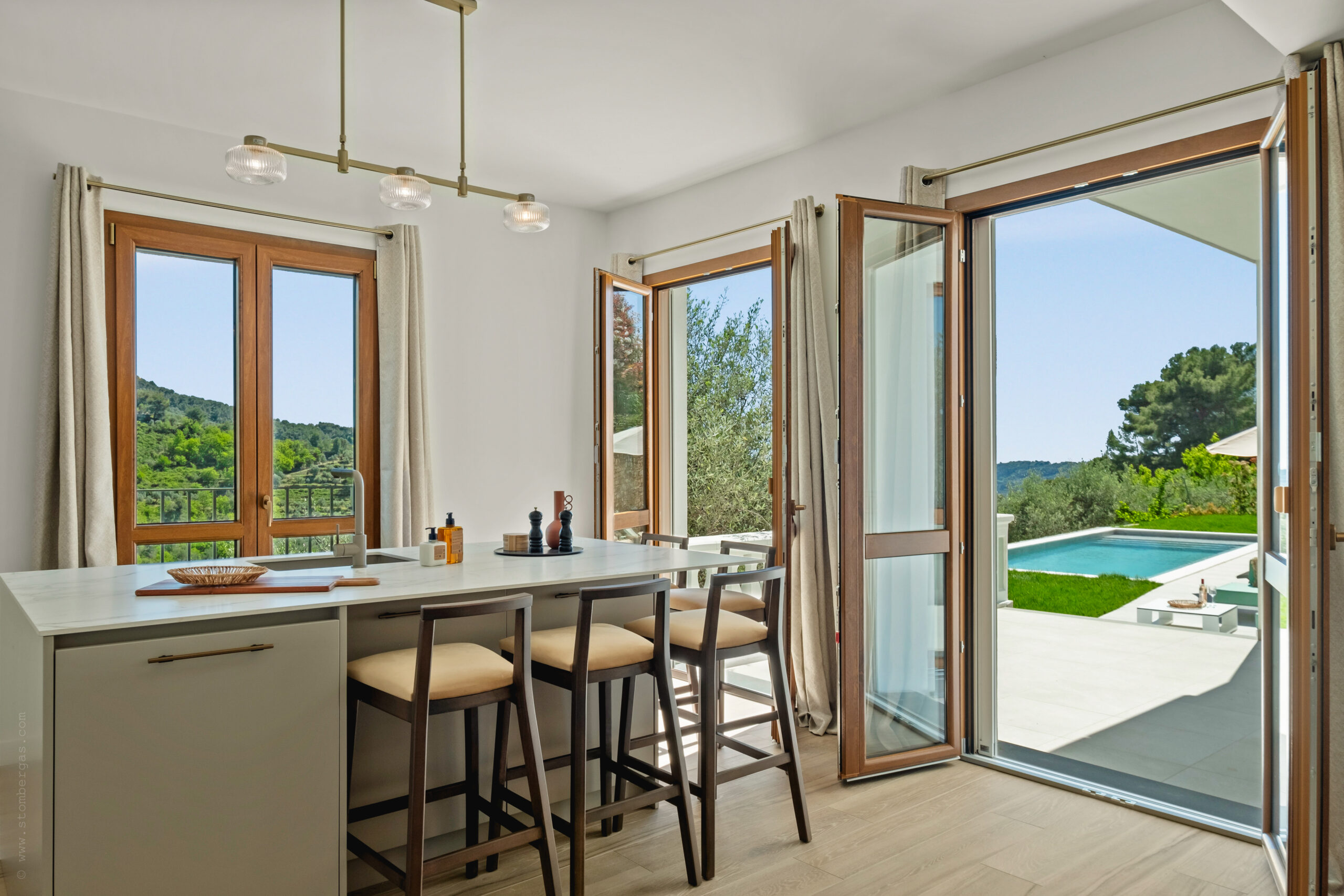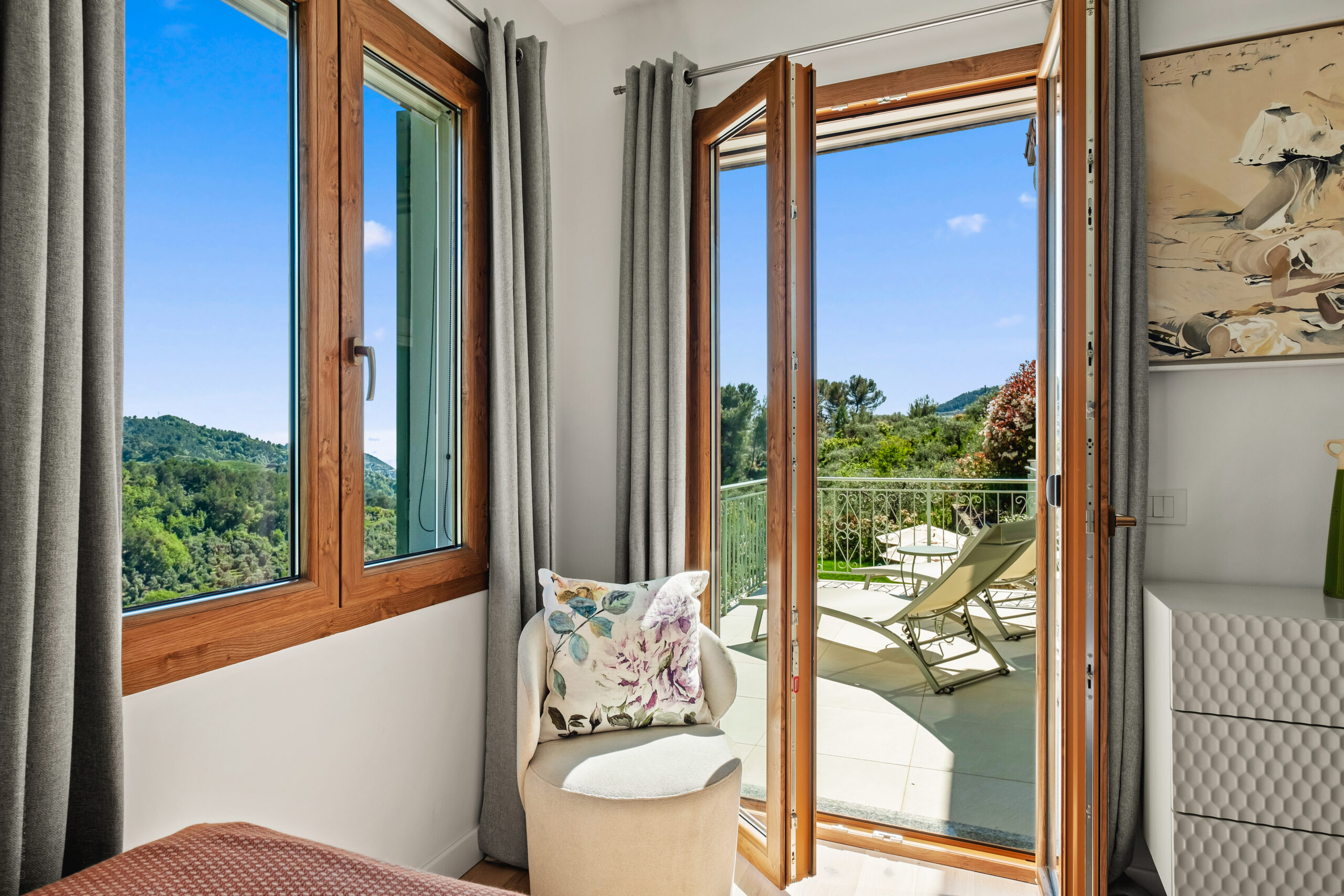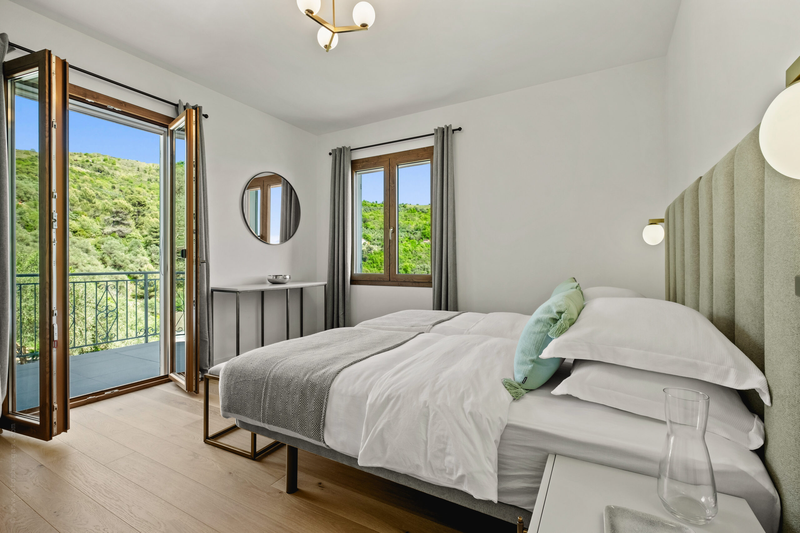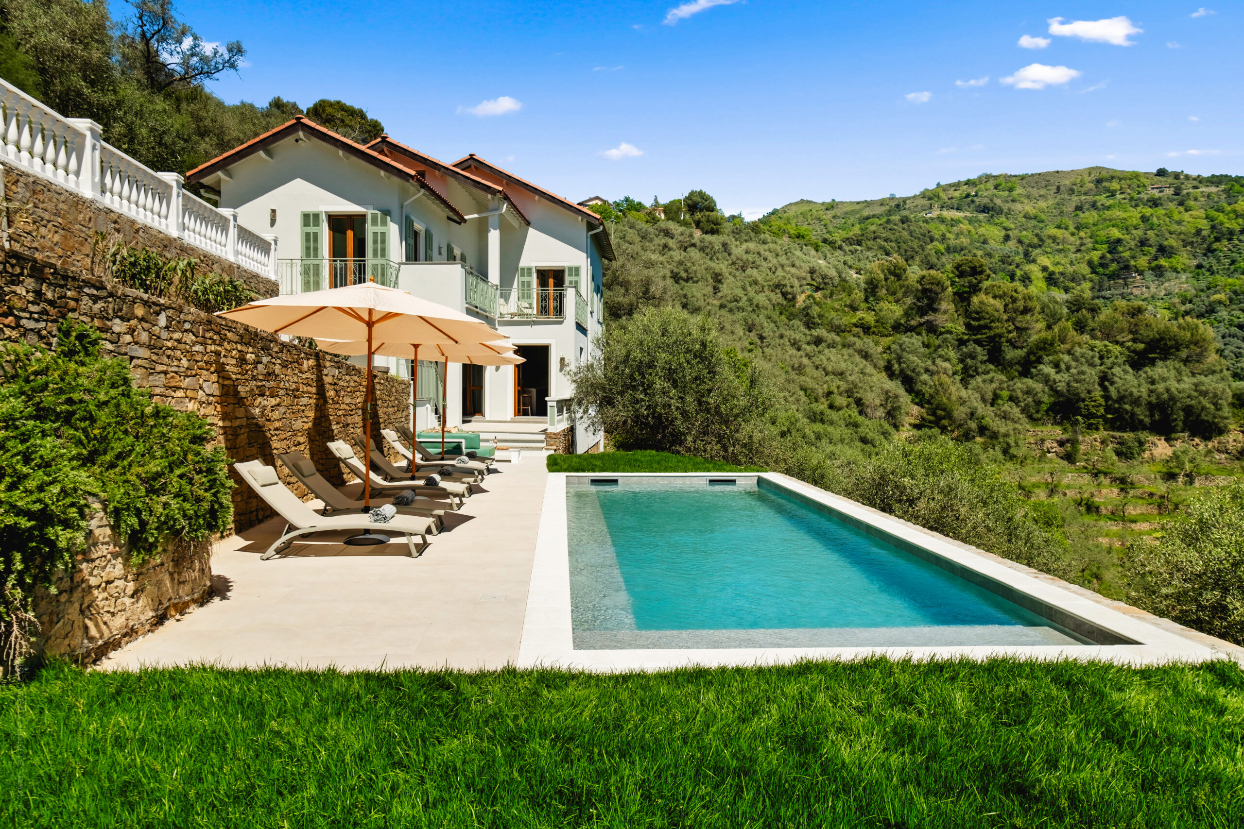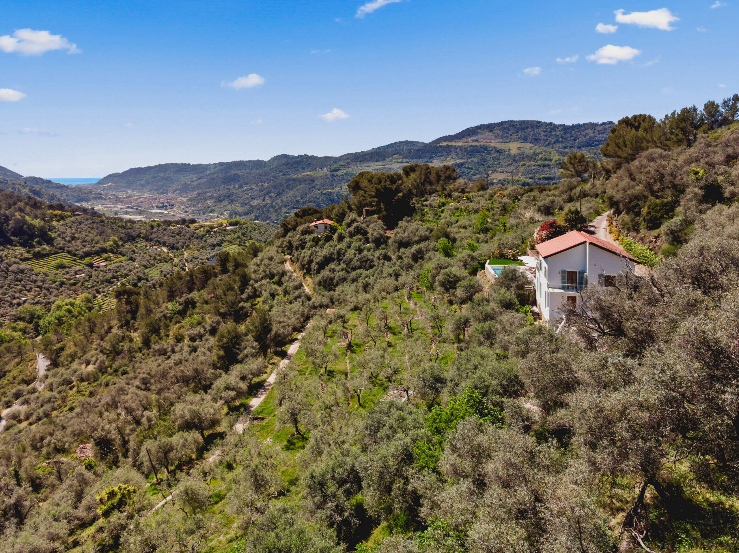 Gli spazi esterni sono un’oasi di quiete: circa 1.900 mq di terreno con ulivi secolari e alberi da frutto che fanno da cornice ad una piscina riscaldata a sfioro con solarium e viste aperte sulla valle e sulla costa ligure.