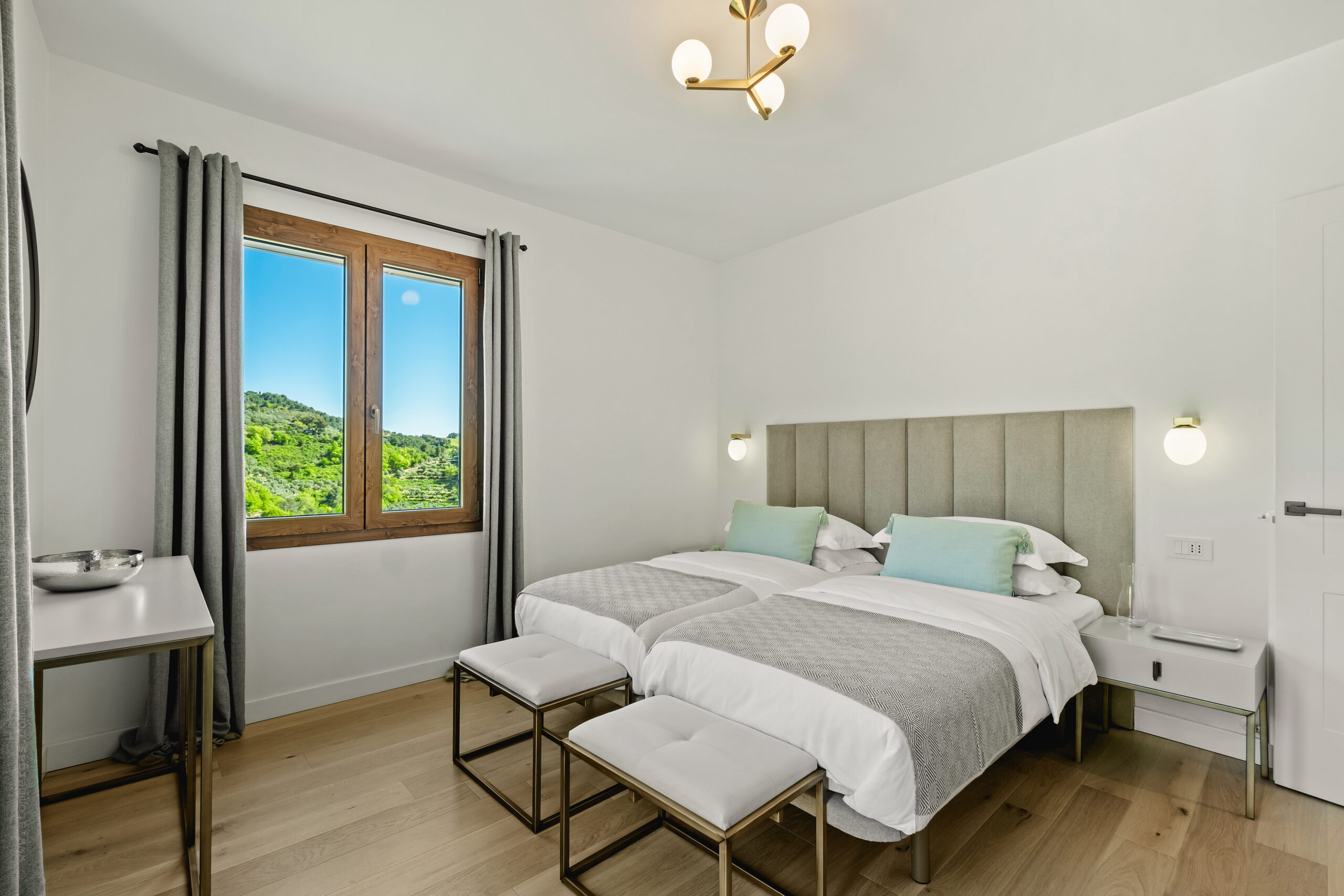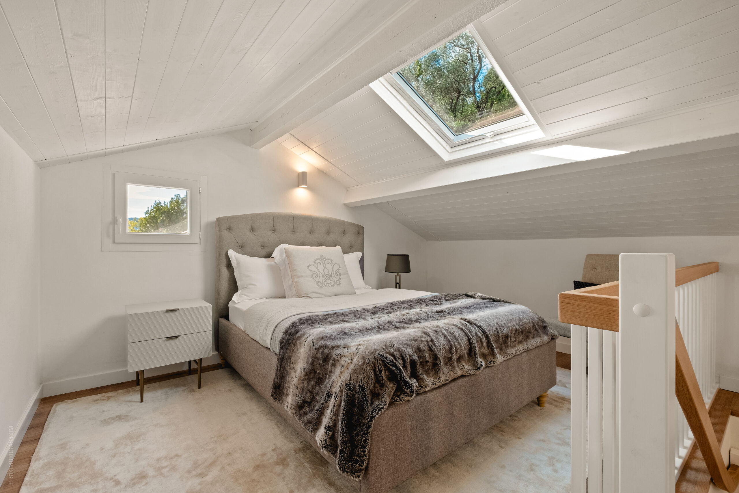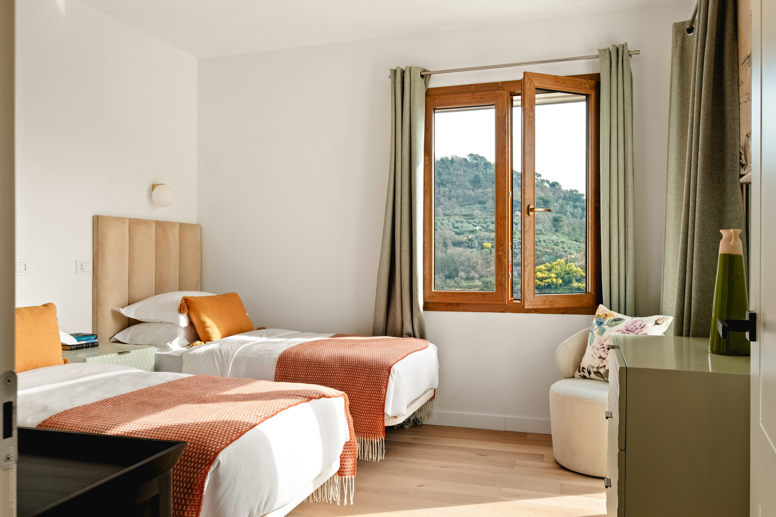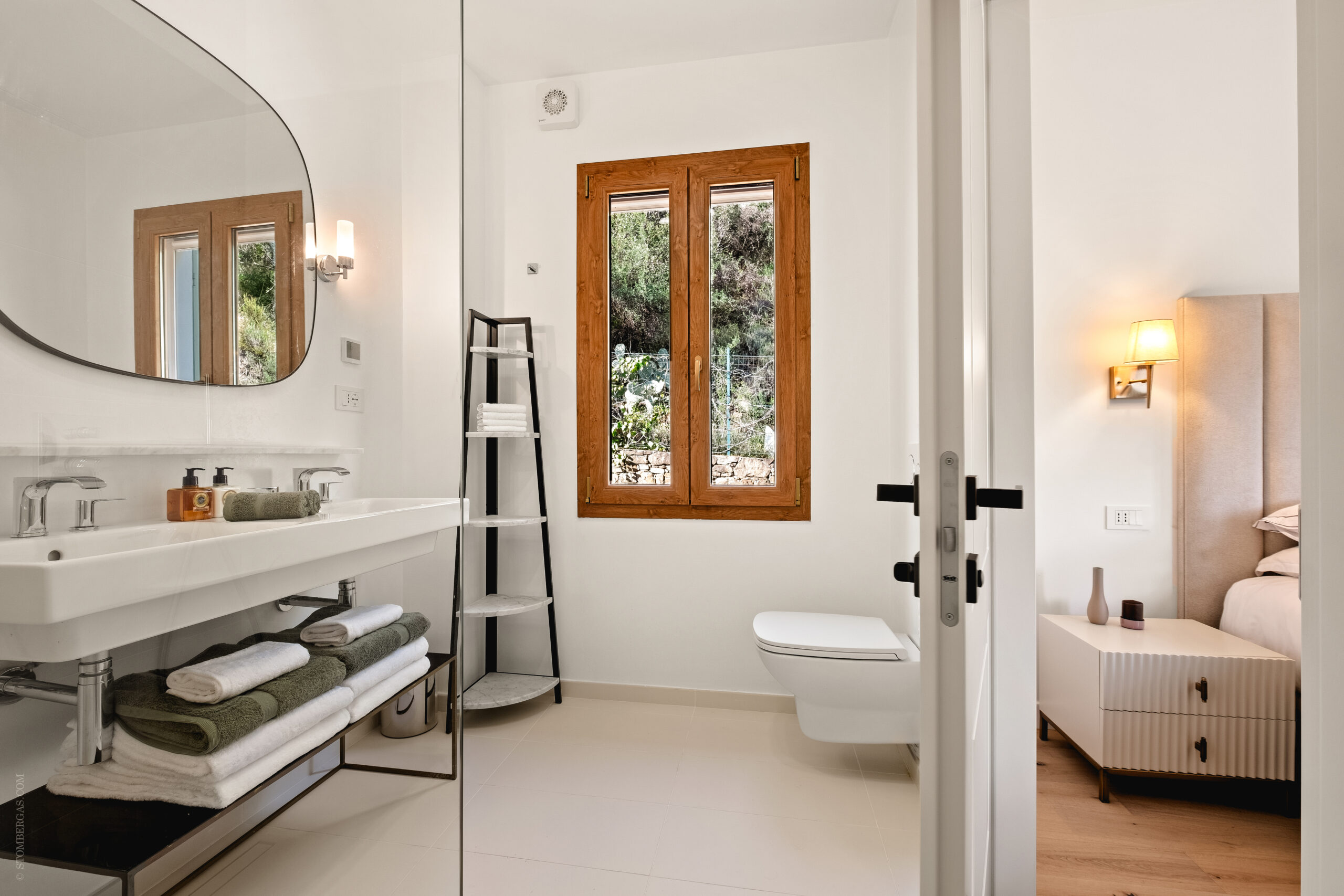 Al primo piano si trova la zona notte, composta da una suite padronale con bagno privato e terrazza panoramica, due camere con bagno in condivisione e una terza camera con bagno en-suite.